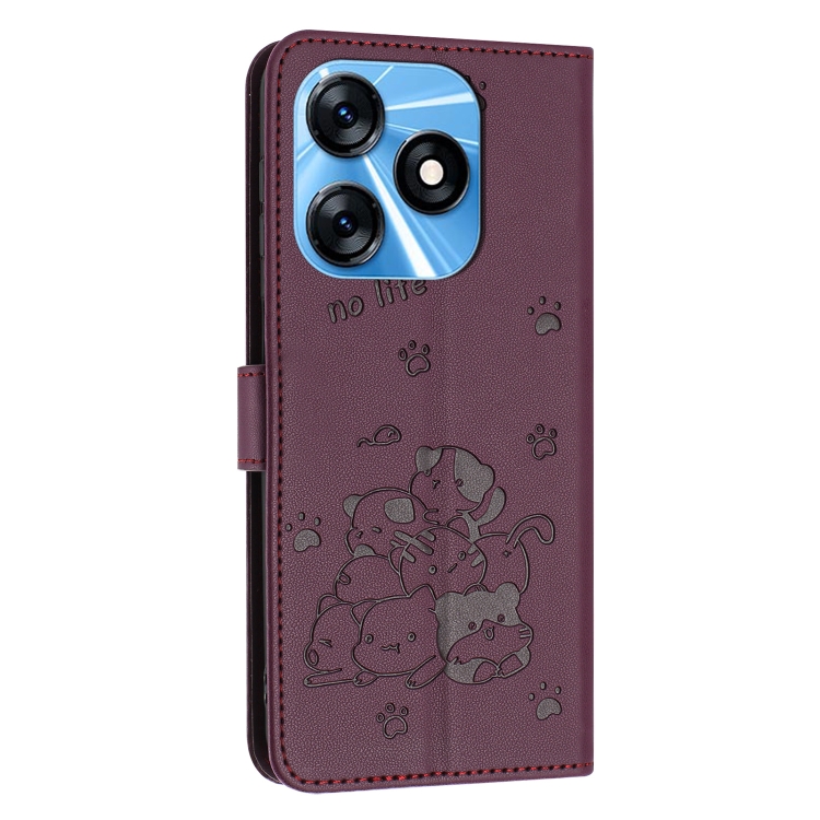 Funda de Cuero para Tecno Spark 10 4G y Spark 10C con Forma de Gatito y Cordón (Rojo Vino)