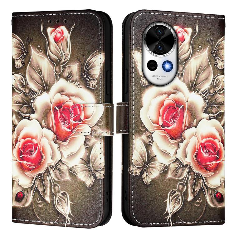 Funda de Cuero para Huawei Nova 13 y Nova 12 con Patrón de Dibujo de Colores (Rosas Sobre Negro)
