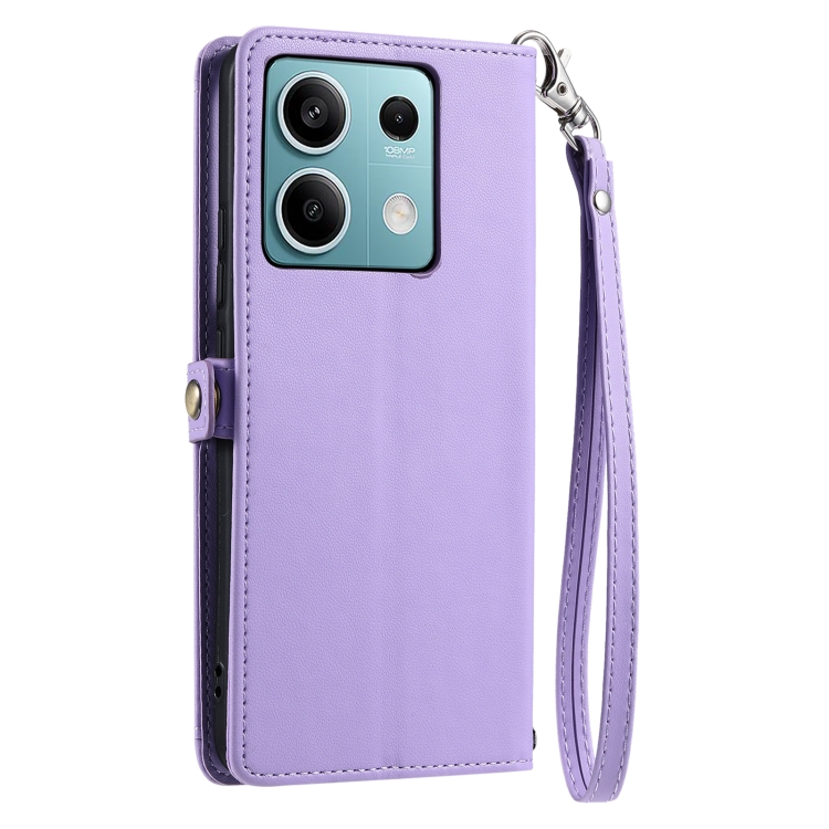 Funda de Cuero con Ranura para Múltiples Tarjetas y Cordón para Redmi Note 13 5G Global Wallet (Morado)