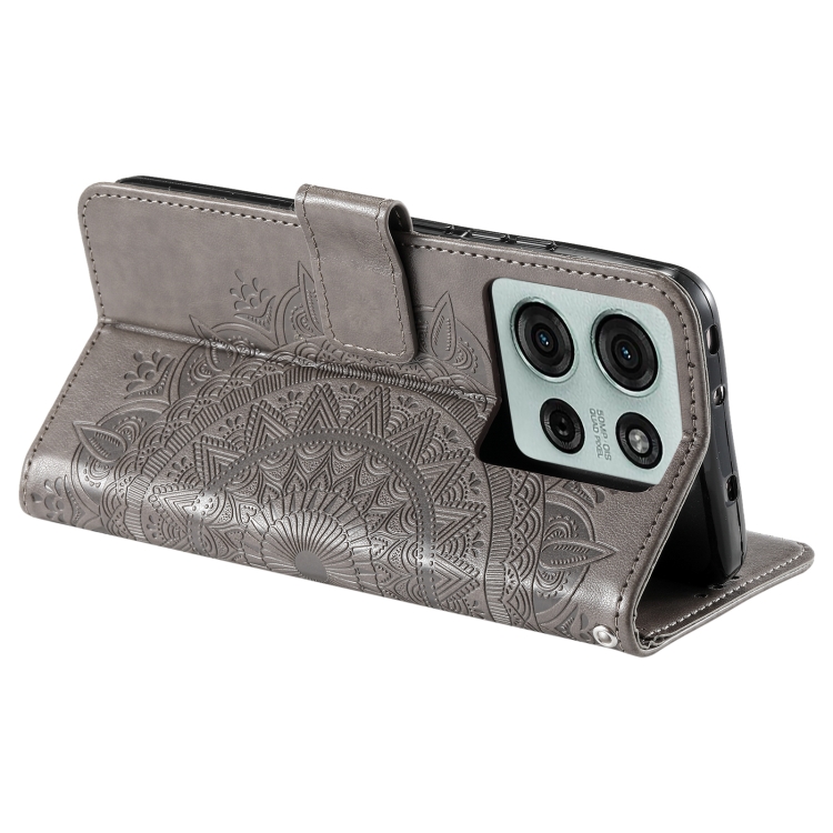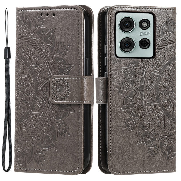 Funda de Cuero con Relieve de Flores para Motorola Moto G75 5G con Cordón (Gris)