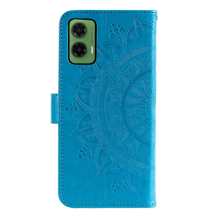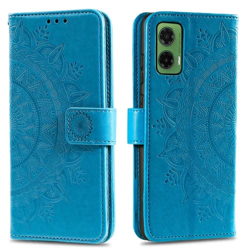 Funda de Cuero con Relieve de Flores y Tótem para Motorola Moto G35 con Cordón (Azul)