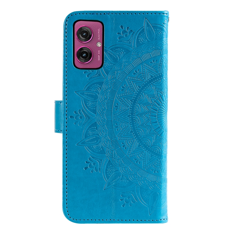 Funda de Cuero con Relieve de Flores y Tótem para Motorola Moto G55 con Cordón (Azul)