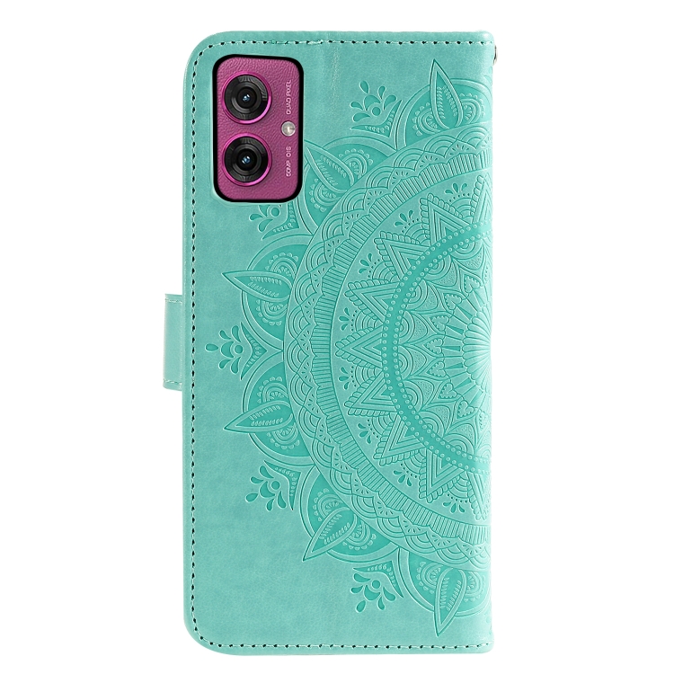 Funda de Cuero con Relieve Flores y Tótem para Motorola Moto G55 con Cordón (Verde)