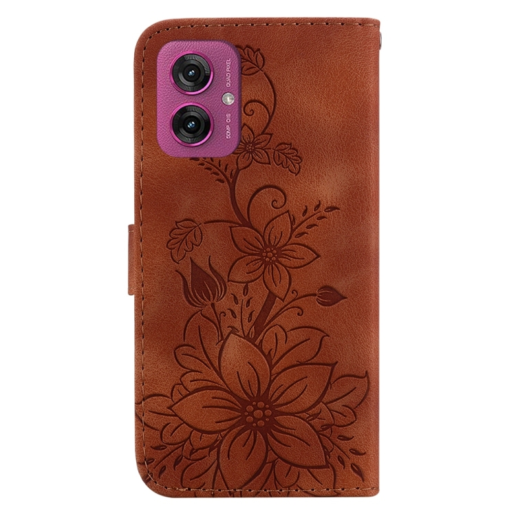 Funda de Cuero con Relieve de Lirios para Motorola Moto G55 (Marrón)
