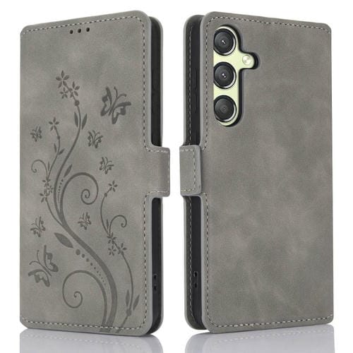 Funda de Cuero Samsung Galaxy A25 5G Global Dreamy Relieve Mariposa y Flor de Amor (Gris)