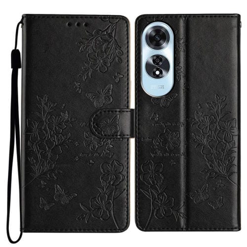 Funda de Cuero con Relieve de Mariposa y Flor para Oppo A60 (Negra)