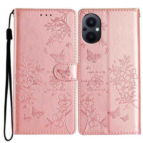 Funda de Cuero con Relieve de Mariposa y Flor para Oppo Reno8 Lite 5G (Oro Rosa)
