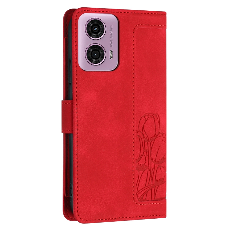 Funda de Cuero con Relieve de Tulipanes para Motorola Edge 5G (2024) con Cordón (Rojo)