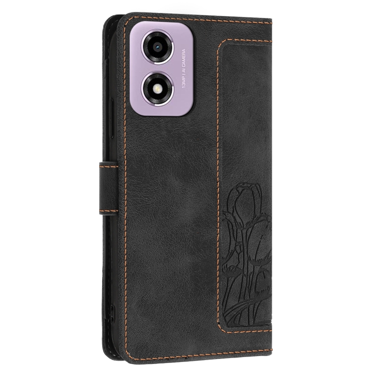 Funda de Cuero con Relieve de Tulipanes para Motorola Moto E14 con Cordón (Negro)