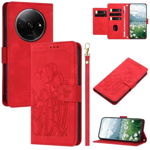 Funda de Cuero con Relieve de Tulipanes para Redmi A3 con Cordón (Rojo)