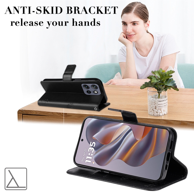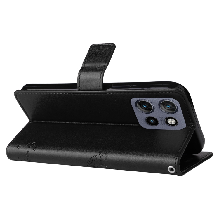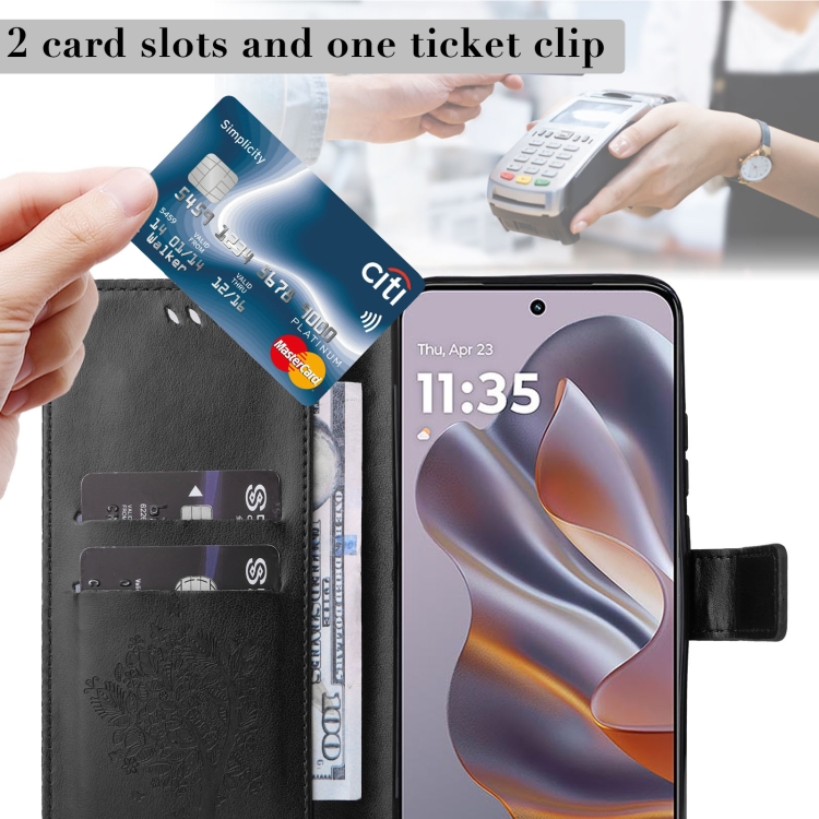 Funda de Cuero con Tapa para Motorola Edge 50 Neo con Diseño de Árbol y Gato en Relieve (Negra)