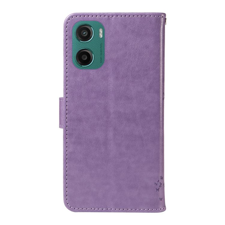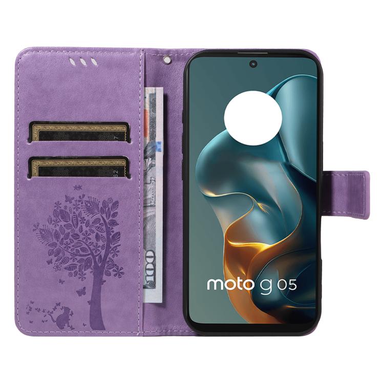 Funda de Cuero con Tapa para Motorola Moto G05 con Diseño de Árbol y Gato en Relieve (Morado Claro)