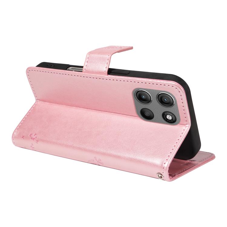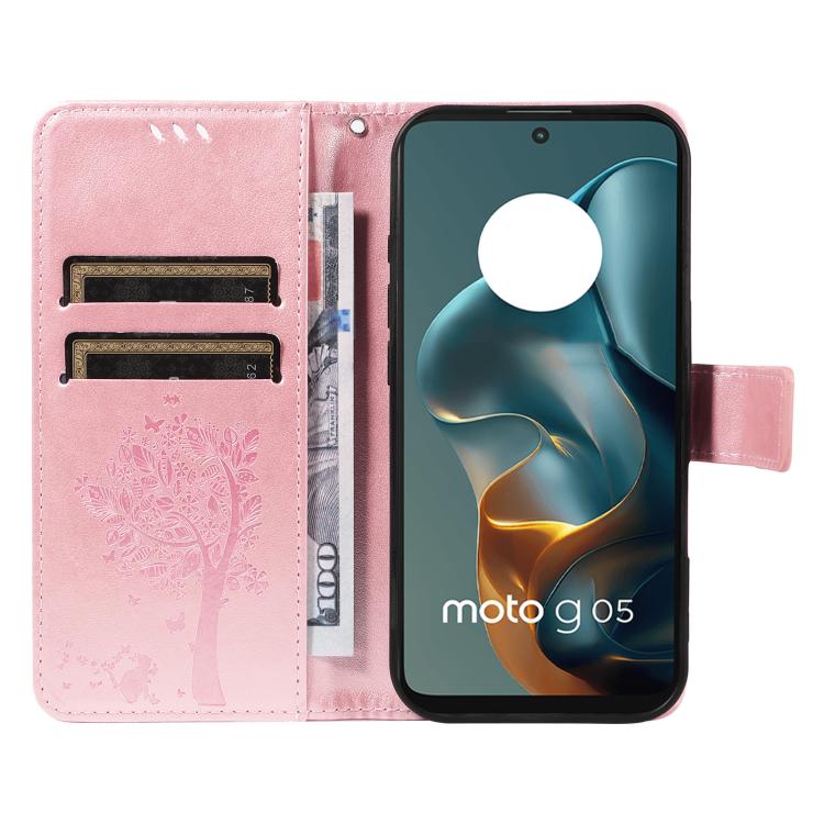 Funda de Cuero con Tapa para Motorola Moto G15 con Diseño de Árbol y Gato en Relieve (Oro Rosa)