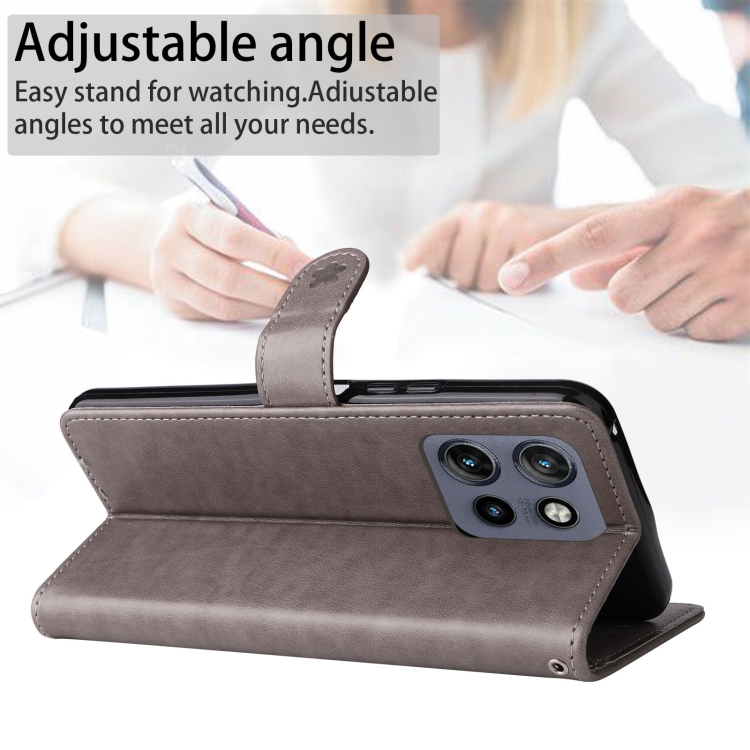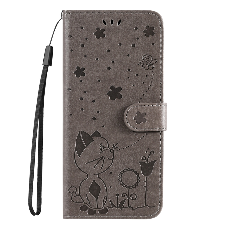 Funda de Cuero con Tapa para Motorola Edge 50 Neo con Diseño de Gato y Abeja en Relieve (Gris)