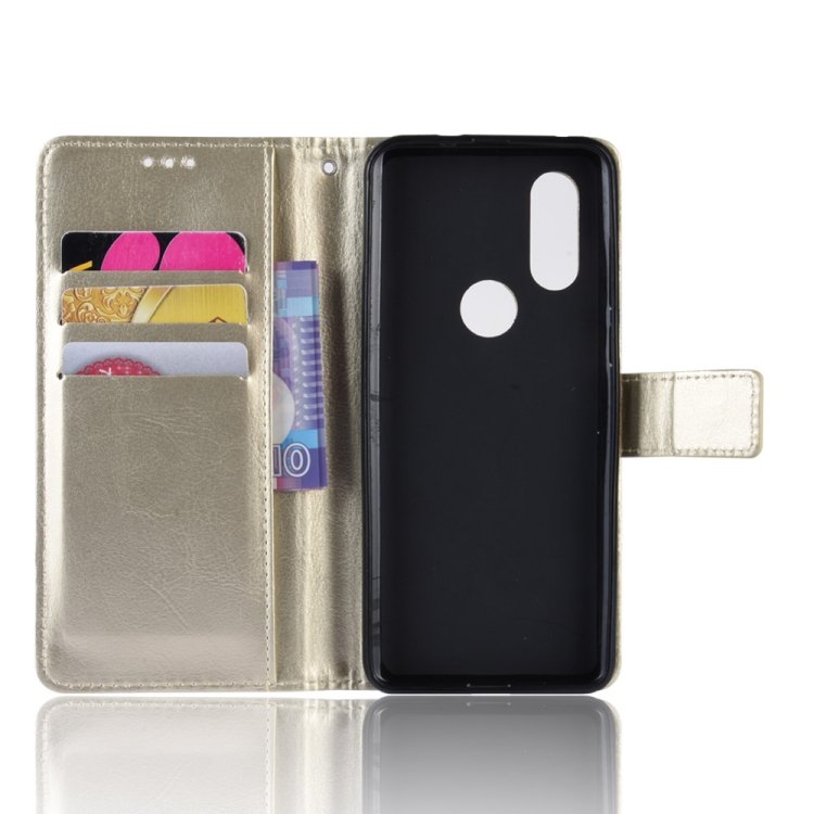 Funda de Cuero Motorola Moto One Vision con Tapa Horizontal Retro, Soporte, Ranuras y Marco de Fotos (Dorado)