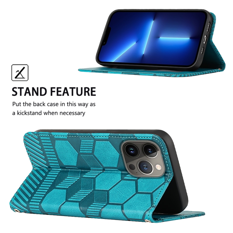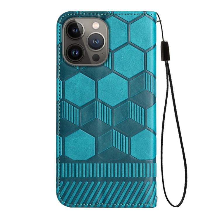 Funda de Cuero para iPhone 13 Pro con Tapa Magnética y Textura de Fútbol (Azul Claro)