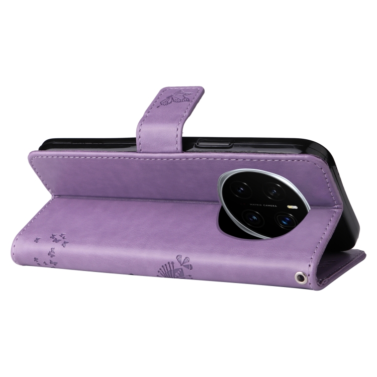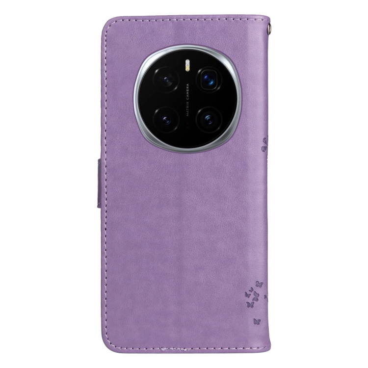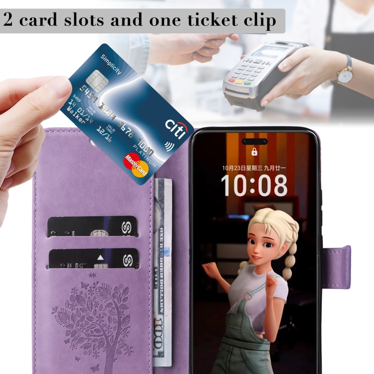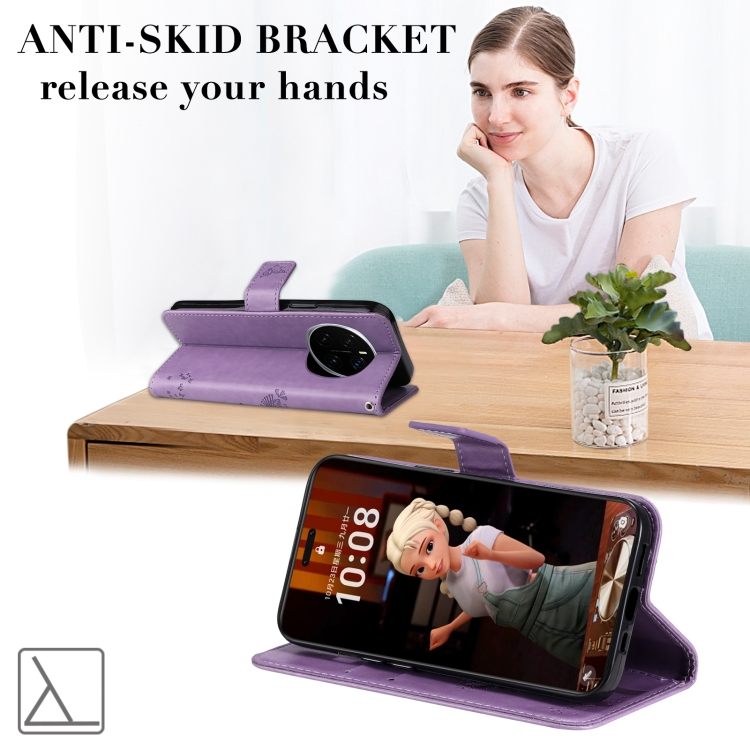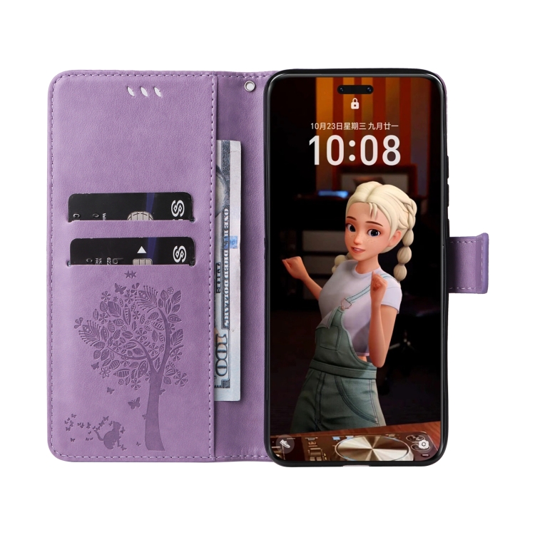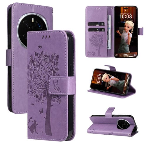 Funda de Cuero con Tapa para Honor Magic7 Pro Diseño Árbol y Gato en Relieve (Morado Claro)