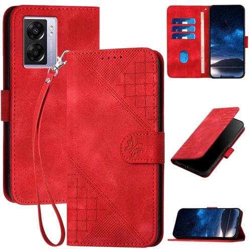 Funda de Cuero con Tapa y Cordón para Oppo A57 5G/A77 5G Yx0080 con Diseño En Relieve de Mariposa y Cuadrícula (Rojo)