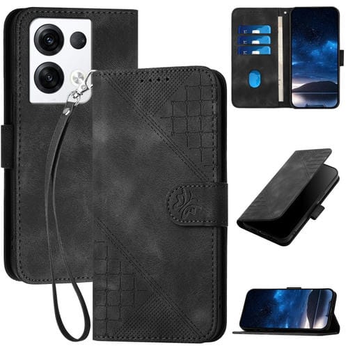 Funda de Cuero con Tapa y Cordón para Oppo Reno10 Pro 5G Global Yx0080 con Diseño En Relieve de Mariposa y Cuadrícula (Negro)