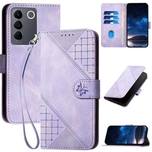 Funda de Cuero con Tapa y Cordón para Vivo V27 Pro 5G Global Yx0080 con Diseño En Relieve de Mariposa y Cuadrícula (Morado Claro)