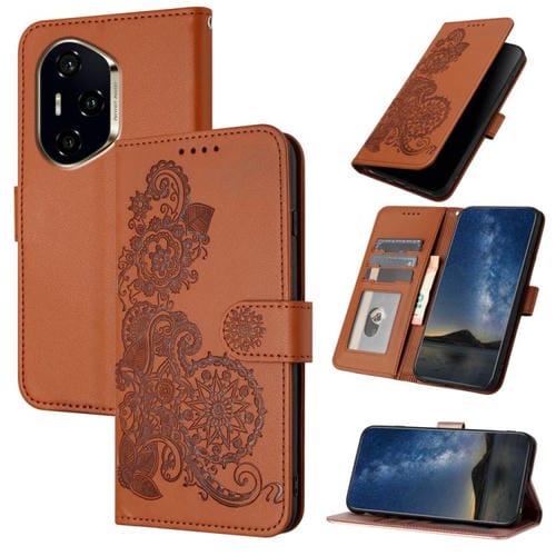 Funda de Cuero con Tapa y Flor de Datura en Relieve para Honor 300 Pro/Honor 300 Ultra (Marrón)
