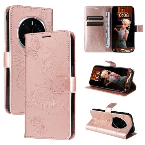 Funda de Cuero con Tapa y Mariposa en Relieve 3D para Honor Magic7 Pro (Oro Rosa)
