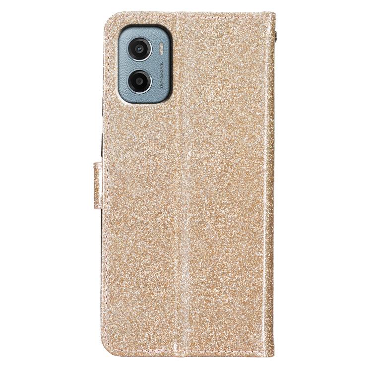Funda de Cuero con Tapa y Purpurina para Motorola Moto E15 (Dorada)