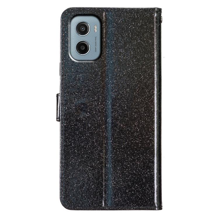 Funda de Cuero con Tapa y Purpurina para Motorola Moto E15 (Negra)