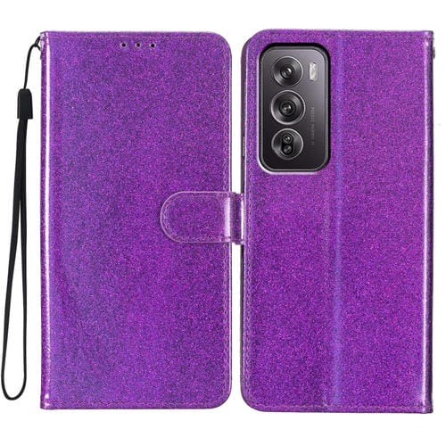 Funda de Cuero con Tapa y Purpurina para Oppo Reno12 Pro (Morada)