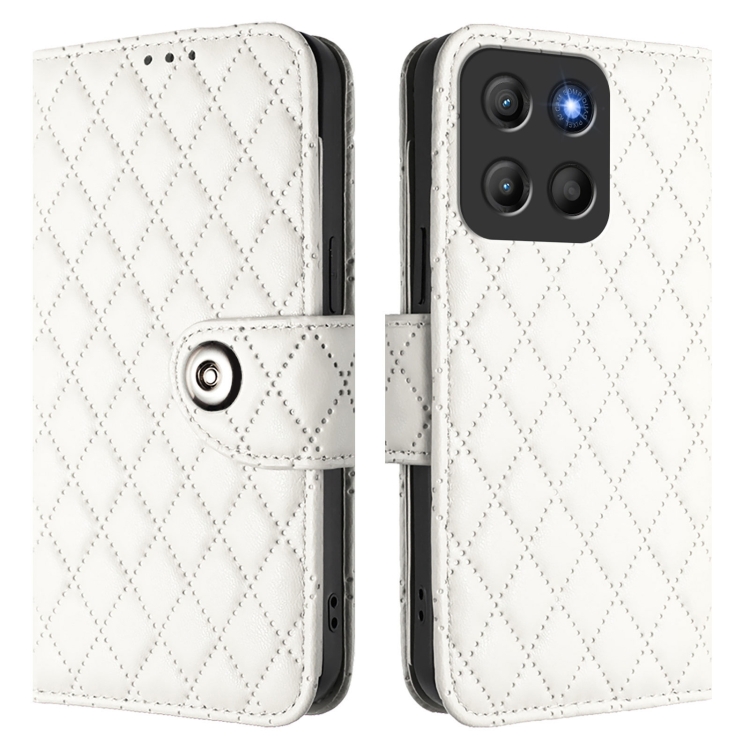 Funda de Cuero con Tapa y Textura Rombal para Motorola Moto G15 con Cordón (Blanco)