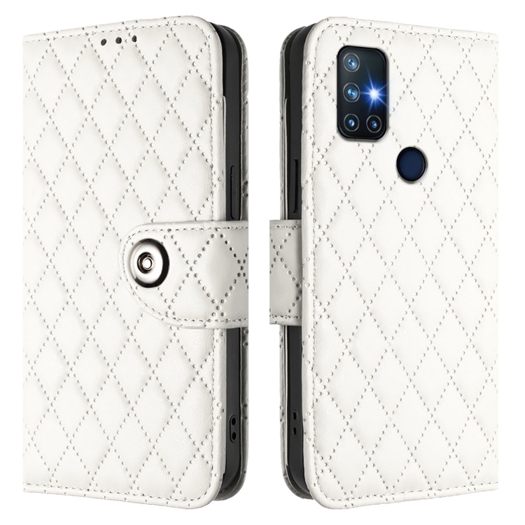 Funda de Cuero con Tapa y Textura Rombal para OnePlus Nord N10 5G con Cordón (Blanco)