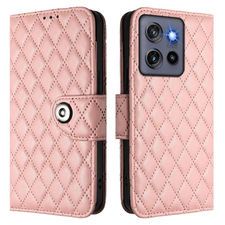 Funda de Cuero con Tapa y Textura Rómbica para Motorola Moto G Stylus 5G (2025) con Cordón (Rosa Coral)