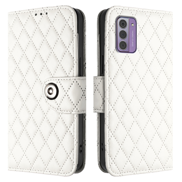 Funda de Cuero con Tapa y Textura Rómbica para Nokia G42/G310 con Cordón (Blanco)