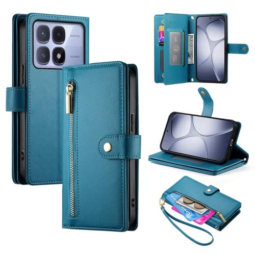 Funda de Cuero para Teléfono Redmi K70 Ultra con Nueve Ranuras para Tarjetas y Cremallera (Azul)