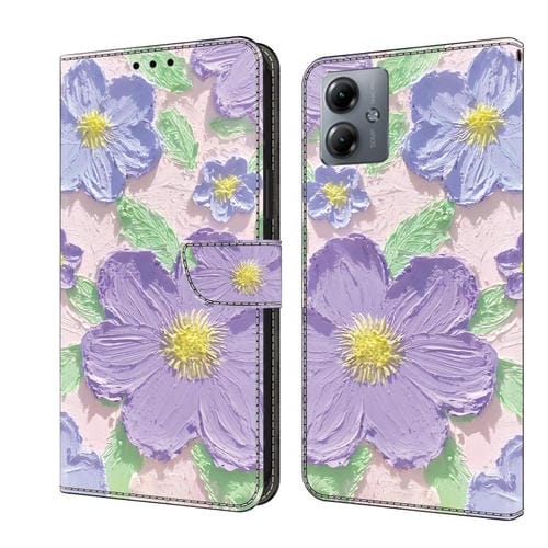 Funda de Cuero para Motorola Moto G14 Pintada al Óleo con Flores Moradas