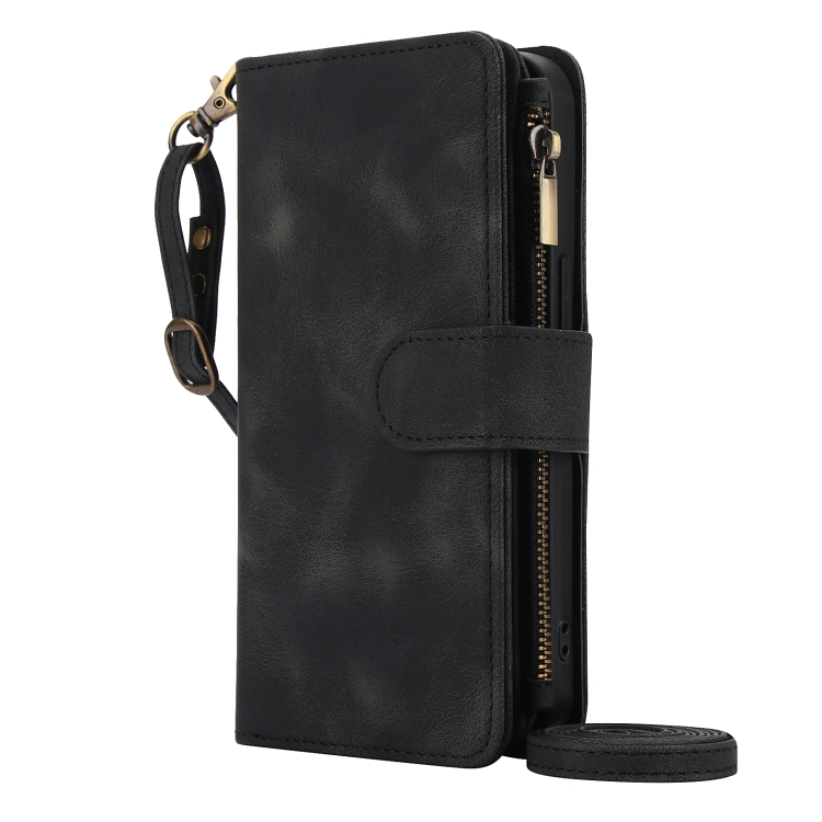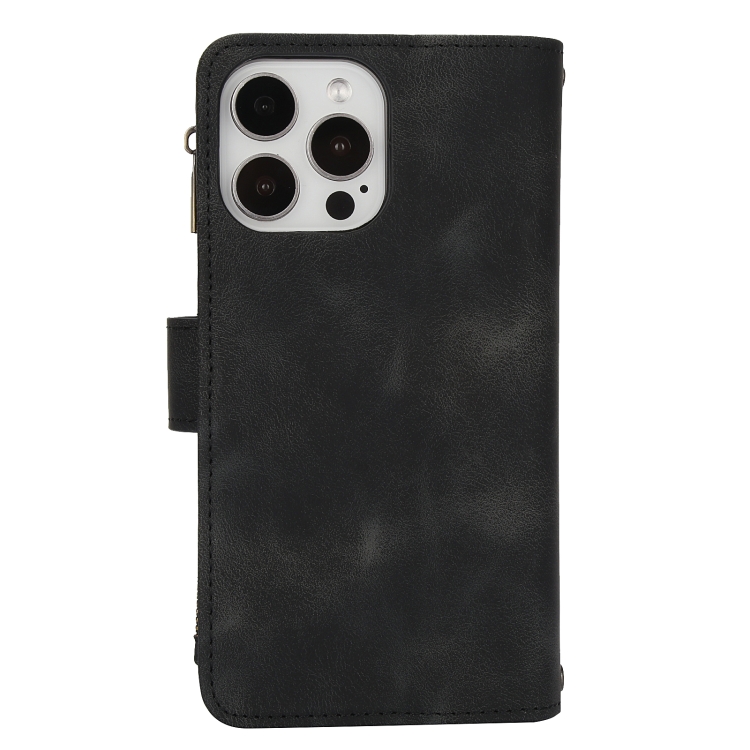 Funda de Cuero Rfid con Cremallera para iPhone 16 Pro Dream con 9 Tarjetas y Cordón (Negro)