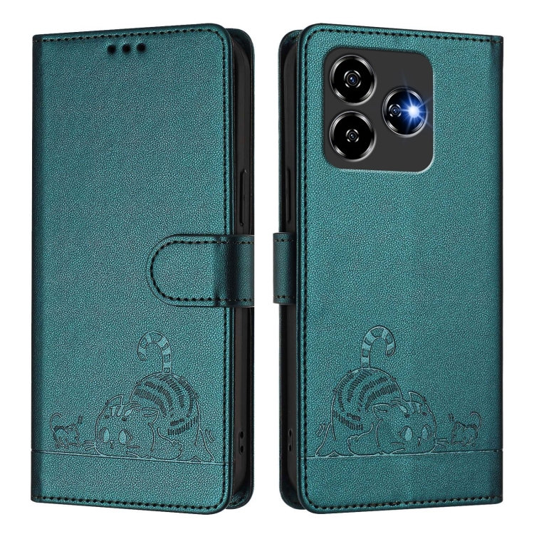 Funda de Cuero Rfid para ZTE Blade V60 con Diseño de Gato y Rata En Relieve y Cordón (Verde Pavo Real)