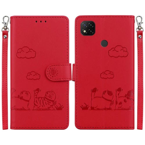 Funda de Cuero Rfid con Diseño de Gatos para Redmi 9C/9 Activ (Roja)