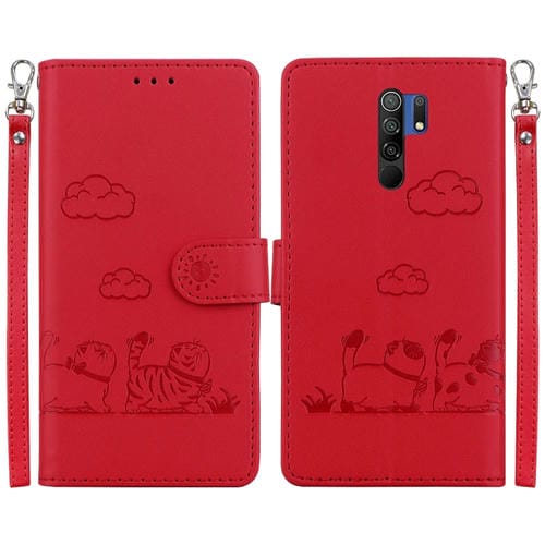 Funda de Cuero Rfid con Diseño de Gatos para Xiaomi Poco M2 (Roja)