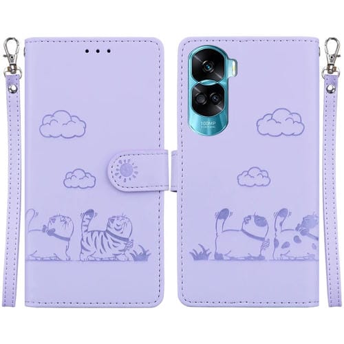 Funda de Cuero Rfid para Honor 90 Lite con Diseño de Gatos (Morado)