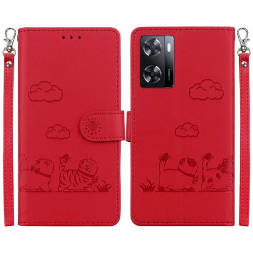 Funda de Cuero Rfid con Diseño de Gatos para Oppo A57 5G / A77 5G (Roja)