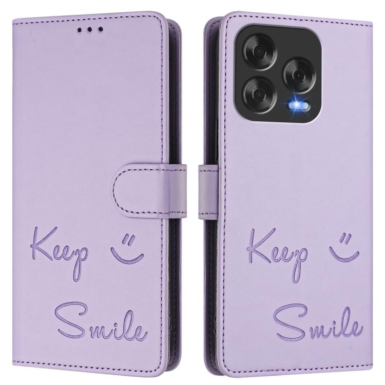 Funda de Cuero Rfid para ZTE Blade V70 con Diseño de Sonrisa en Relieve (Morado Claro)