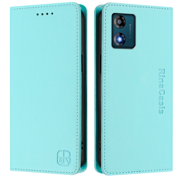 Funda de Cuero Rfid Motorola Moto E13 Rc01 con Doble Pliegue y Succión Magnética (Verde Menta)