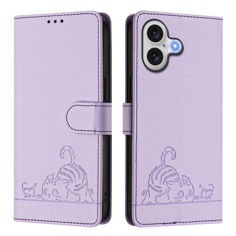 Funda de cuero RFID con estampado de gato y rata para iPhone 17 con cordón (morado)