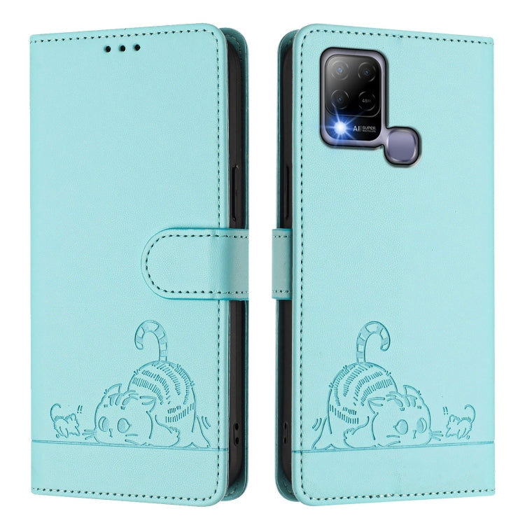 Funda de Cuero Rfid para Infinix Hot 10T/10S con Estampado de Rata y Gato en Relieve y Cordón (Verde Menta)