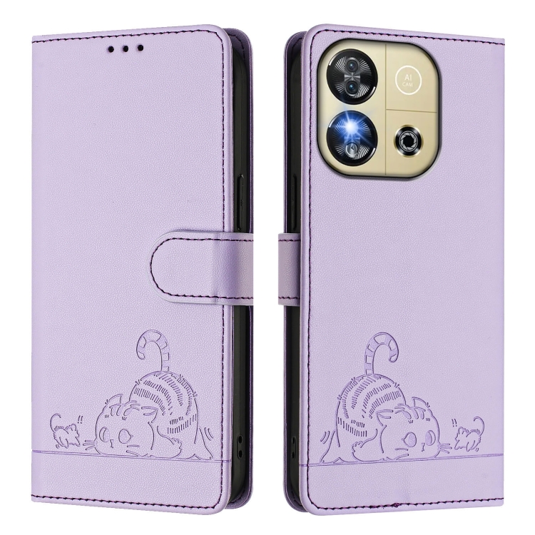 Funda de Cuero Rfid para Oukitel C57S con Estampado de Rata y Gato en Relieve y Cordón (Morado)