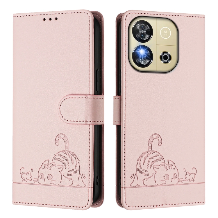 Funda de Cuero Rfid para Oukitel C57S con Estampado de Rata y Gato en Relieve y Cordón (Rosa)