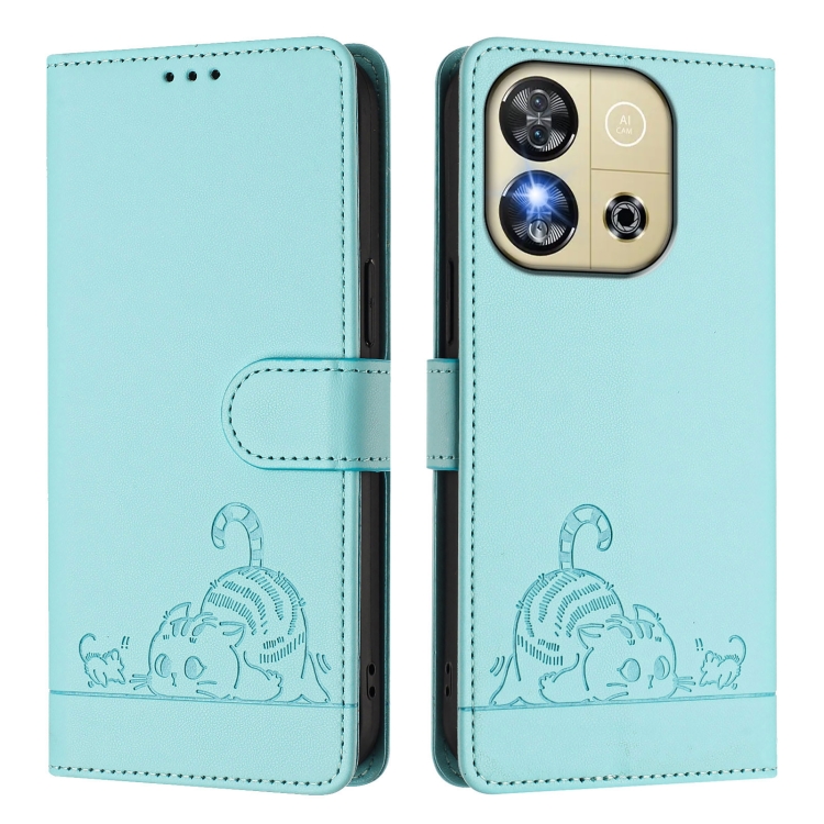 Funda de Cuero Rfid para Oukitel C57S con Estampado de Rata y Gato en Relieve y Cordón (Verde Menta)