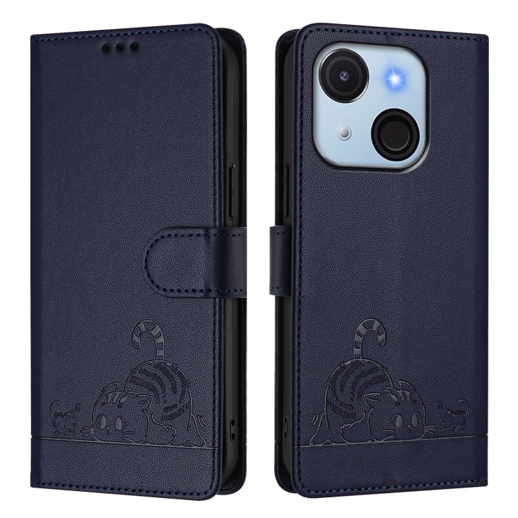 Funda de Cuero Rfid para Teléfono Itel A50C con Estampado de Rata y Gato y Cordón (Azul)