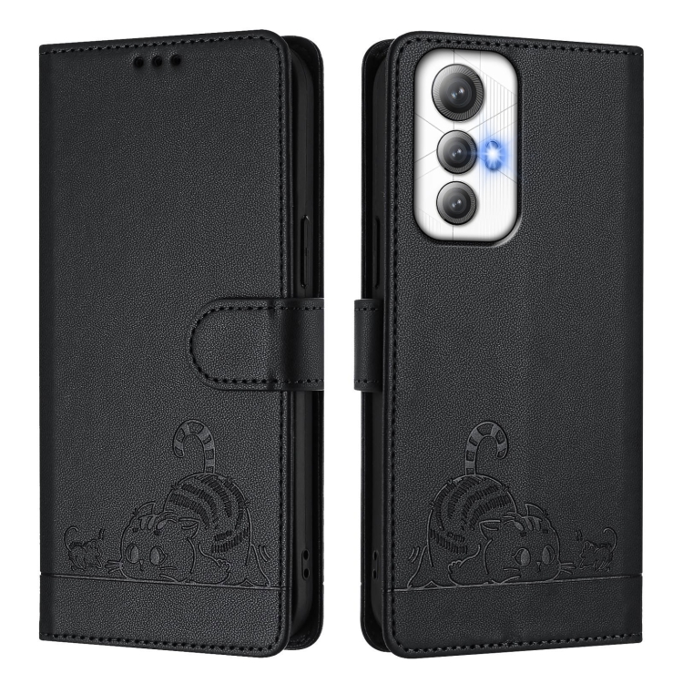 Funda de Cuero Rfid para Cubot Max 5 con Cordón con Patrón en Relieve de Rata y Gato (Negro)